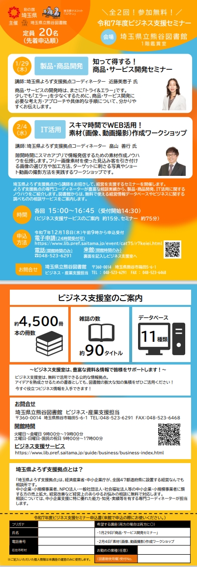 県立熊谷図書館と埼玉県よろず支援拠点が連携し、経営を支援するセミナーを開催します。