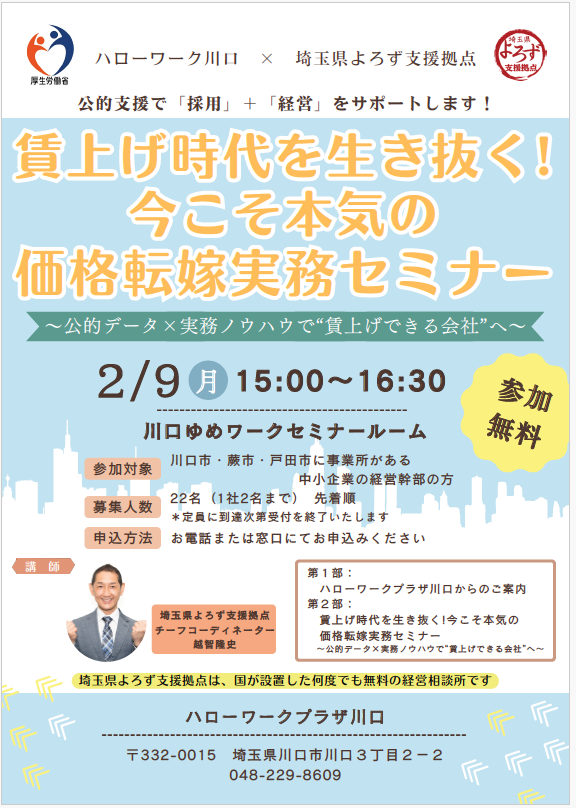 TOP お知らせ一覧 開催日:2026.2.9(月)<ハローワーク川口 × 埼玉県よろず支援拠点主催> 賃上げ時代を生き抜く!今こそ本気の価格転嫁実務セミナー 開催日:2026.2.9(月)<ハローワーク川口 × 埼玉県よろず支援拠点主催> 賃上げ時代を生き抜く!今こそ本気の価格転嫁実務セミナー <ハローワーク川口✕埼玉県よろず支援拠点 主催> 賃上げ時代を生き抜く!今こそ本気の価格転嫁実務セミナー 【ハローワーク川口✕埼玉県よろず支援拠点コラボ企画】 賃上げ時代を生き抜く!今こそ本気の価格転嫁実務セミナー(令和8年2月9日開催)の参加事業所を募集します。 賃上げと物価高の嵐の中で、事業所が生き抜いていく術について、事業所の経営支援に確かな実績のある「埼玉よろず支援拠点」の専門家が丁寧に説明していきます。 是非ご参加ください。 詳細はこちら < 前の記事へ 一覧に戻る